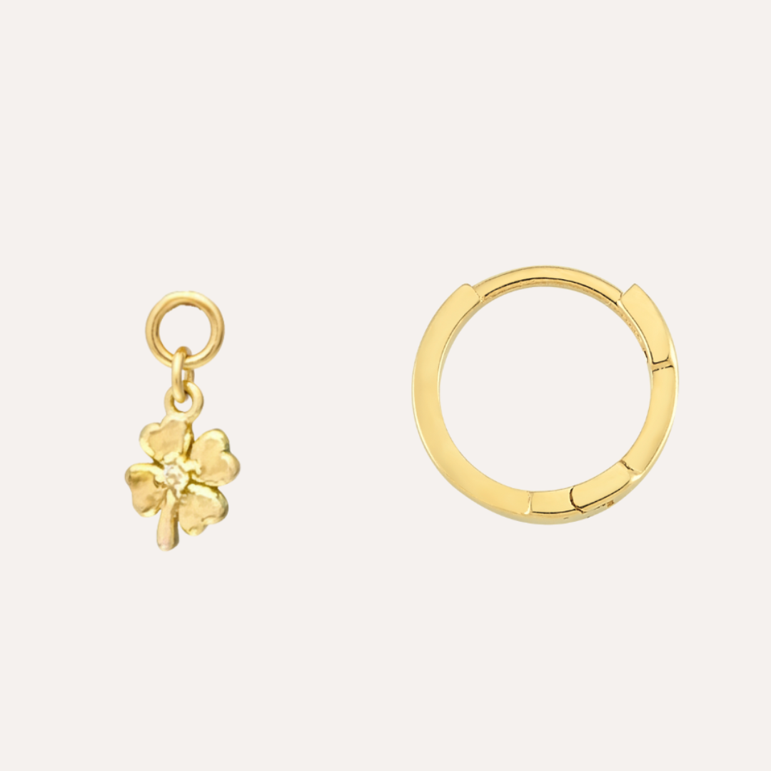 Gold vermeil hanging clover charm easily threaded onto a stud or basic ear hoop to create a stylish new design