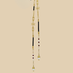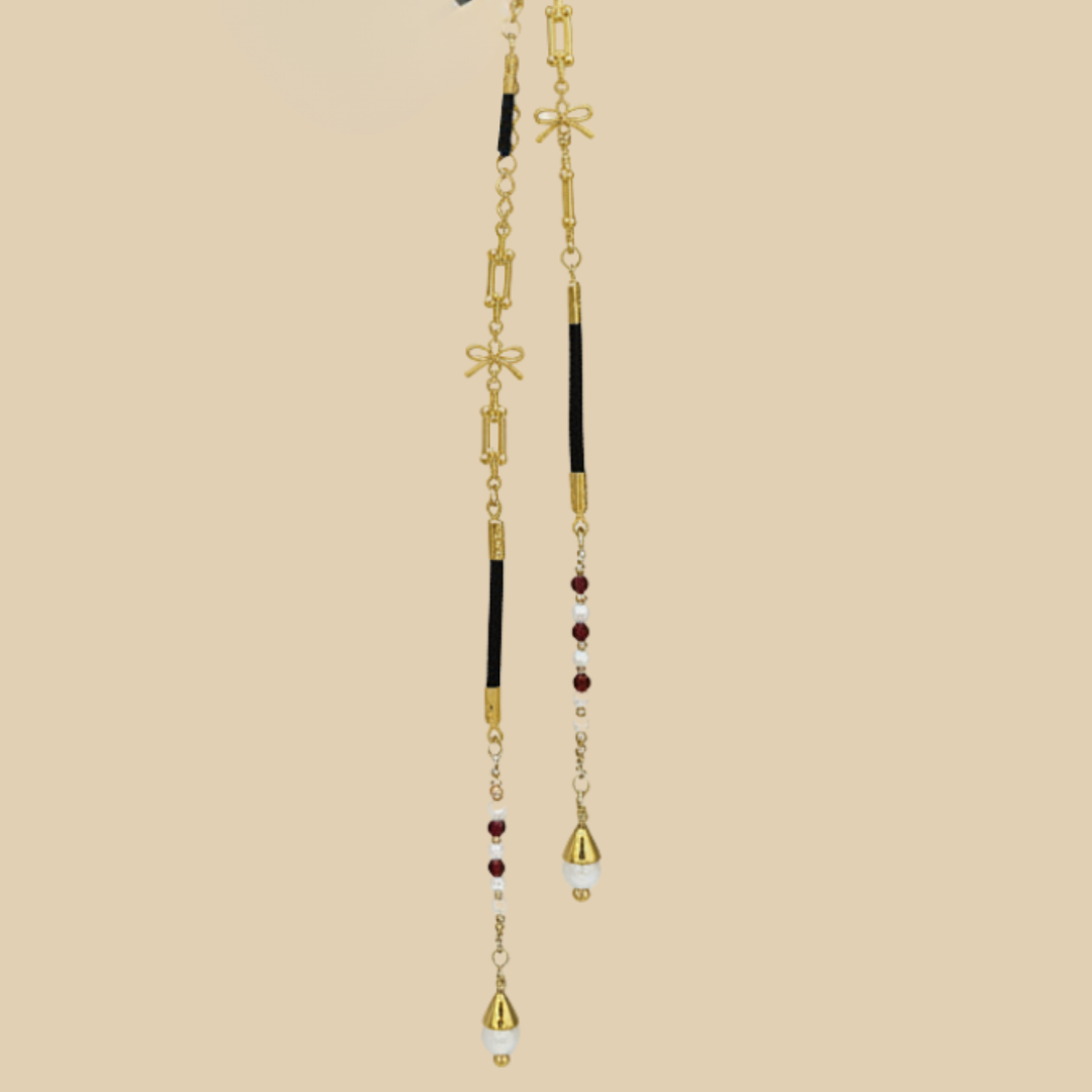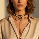 Heavy pearl detailing adds a feminine twist to this western style suede lariette. Gold plated pussy bow details coupled with red garnet embellishment create a striking piece that will ramp up your crisp white shirt or denim mix. Turn your outfit from zero to hero with this must have addition to your winter ensemble. Just the right mix of feminine styling with a sightly western twist